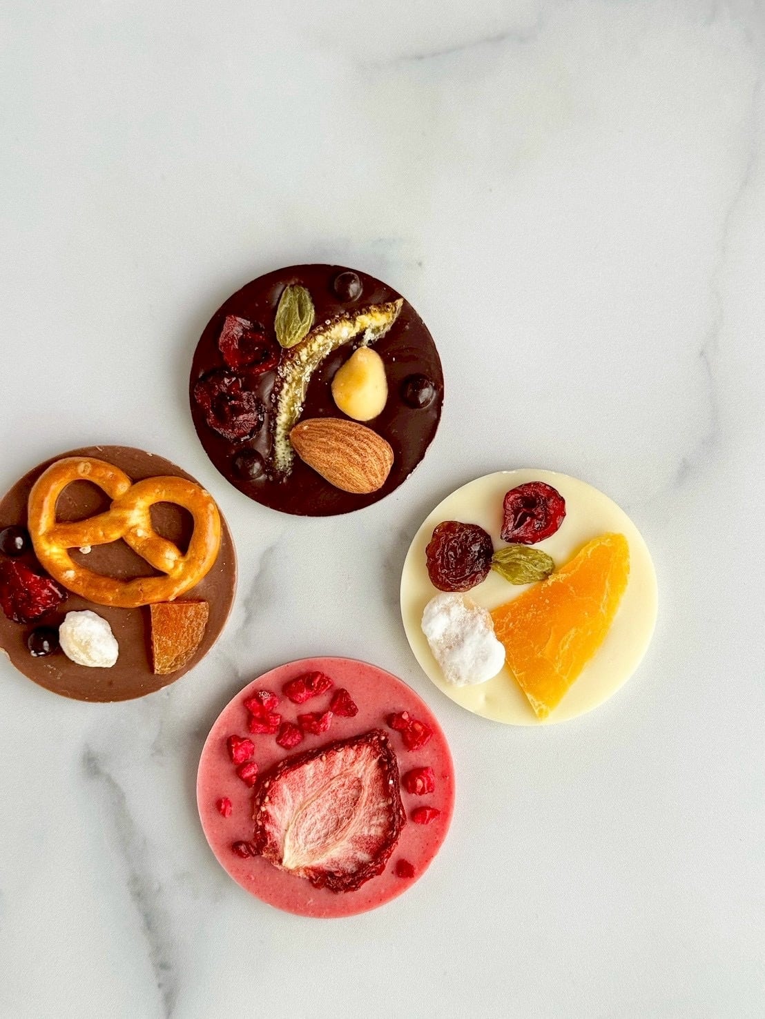選び抜いたクーベルチュールに、産地や製法にこだわった素材を重ねたマンディアン。チョコレートそれぞれの個性と、トッピングとの調和を大切に、一枚ずつ丁寧に仕上げました。